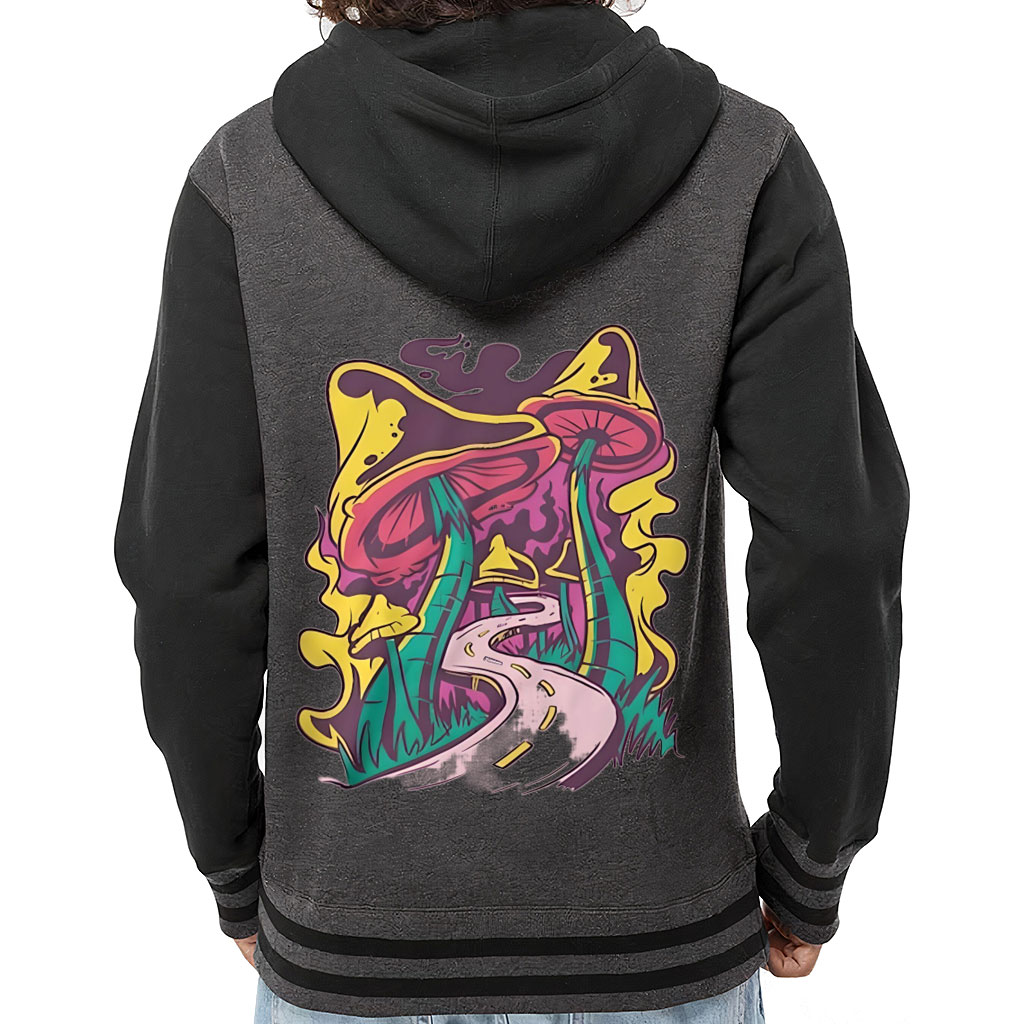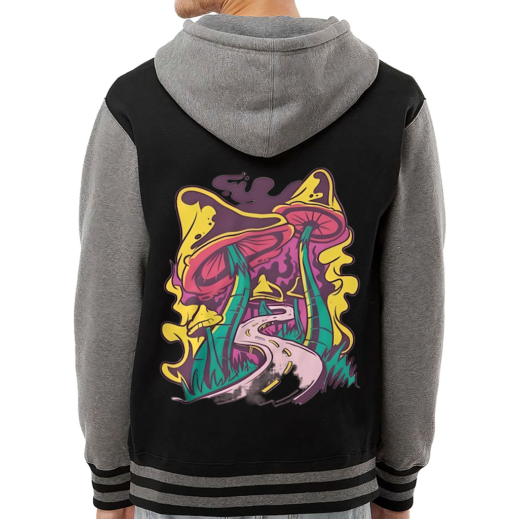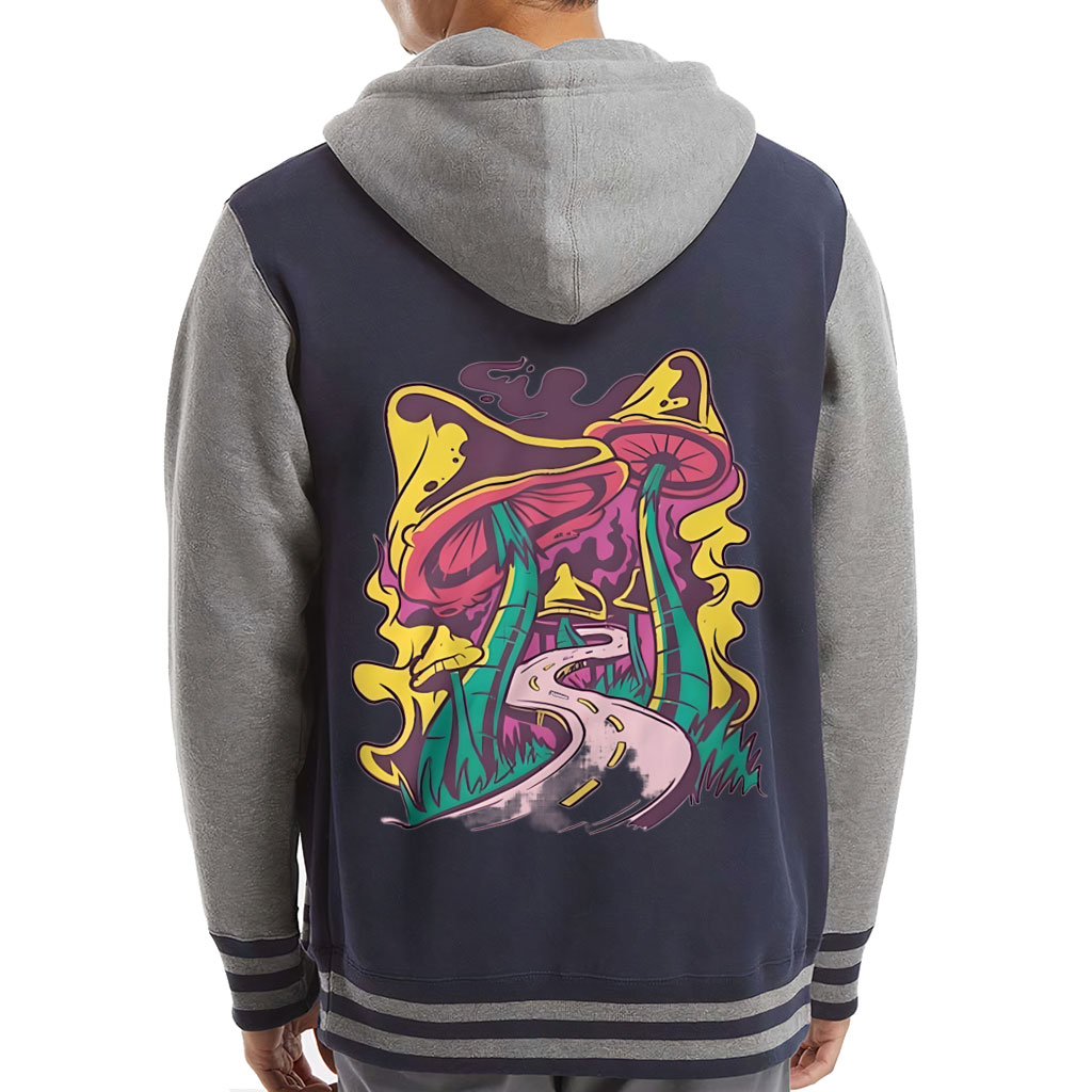 Trippy Mushrooms Varsity Zip Hoodie – Psychedelic Print – Music Festival Apparel