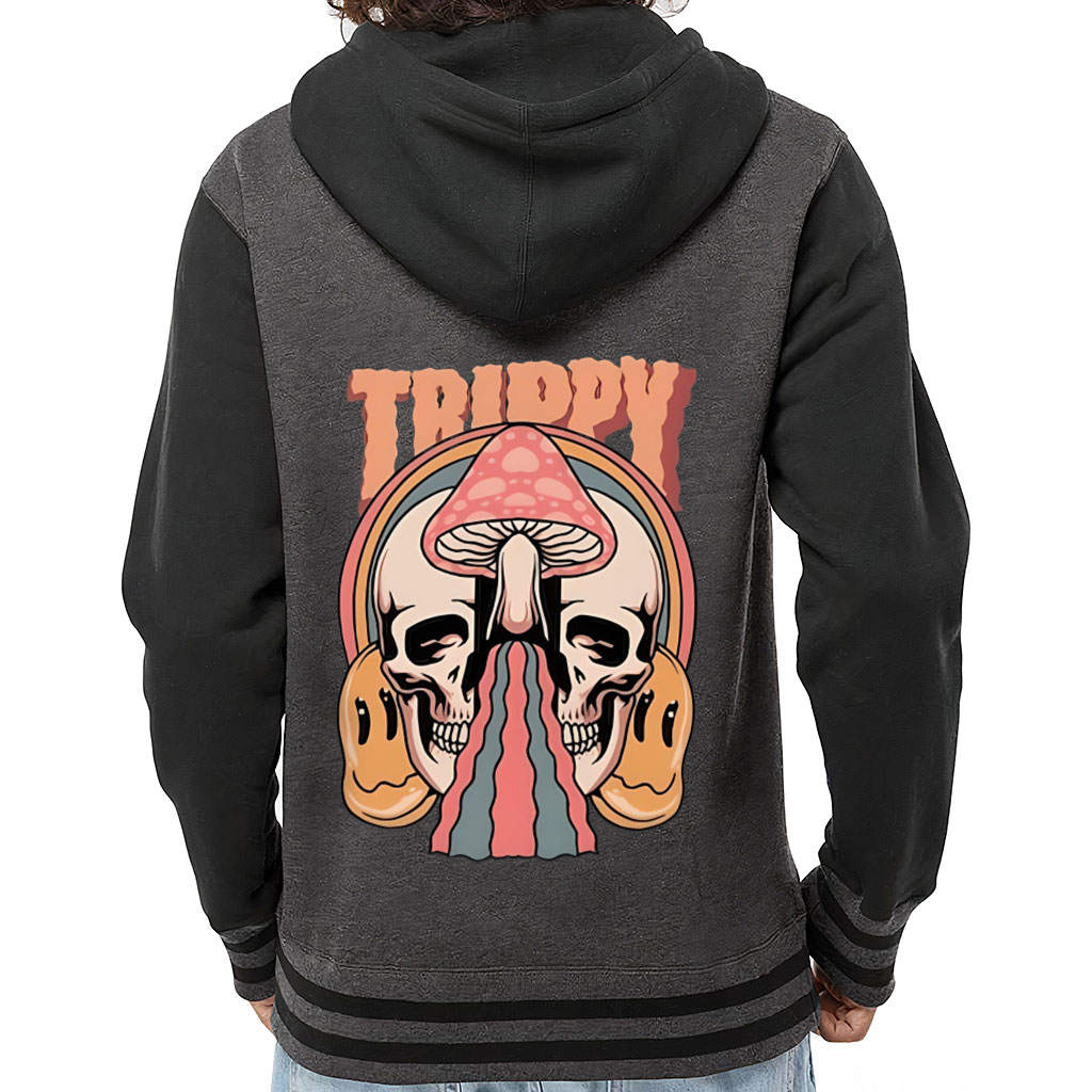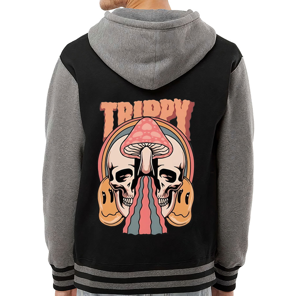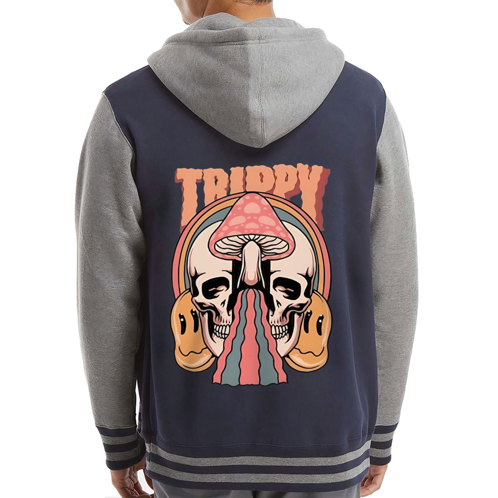 Trippy Varsity Zip Hoodie – Psychedelic Mushroom Prints – Magic Mushroom Clothing