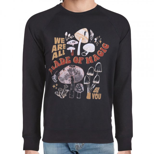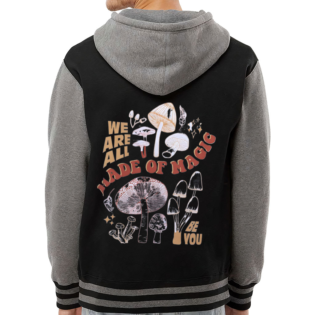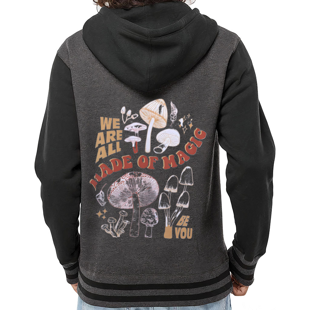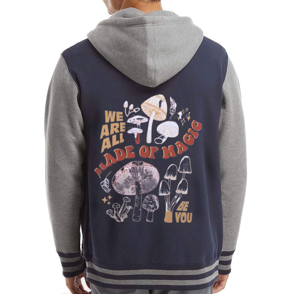 We Are All Made Of Magic Varsity Zip Hoodie – Mushroom Fan Stuff – Mushroom Lover Gift